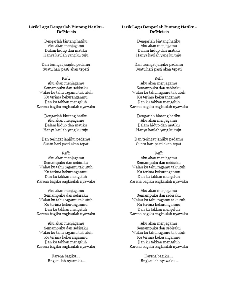 Lirik Lagu Dengarlah Bintang Hatiku De Meises. Aku akan menjagamu semampu dan sebisaku Walau ku tahu ragamu tak utuh Ku terima kekuranganmu dan ku tak akan mengeluh Karena bagiku. Dengarlah bintang hatiku aku akan menjagamu.